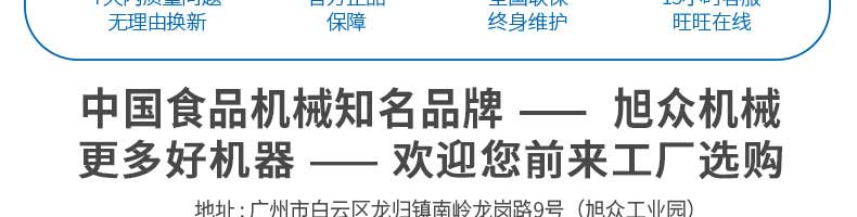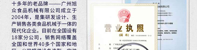 廣州旭眾食品機(jī)械有限公司是一家集科研開發(fā),生產(chǎn)設(shè)計(jì),營銷服務(wù)為一體的現(xiàn)代化生產(chǎn)企業(yè)?,F(xiàn)代化生產(chǎn)車間,精湛制造技術(shù),所產(chǎn)機(jī)械歷經(jīng)市場重重考驗(yàn),不斷贏得海內(nèi)外客戶的贊譽(yù)。