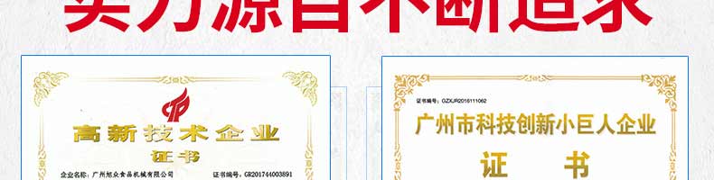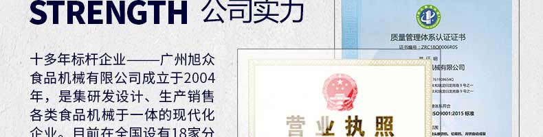 廣州旭眾食品機(jī)械有限公司是一家集科研開發(fā),生產(chǎn)設(shè)計(jì),營銷服務(wù)為一體的現(xiàn)代化生產(chǎn)企業(yè)?,F(xiàn)代化生產(chǎn)車間,精湛制造技術(shù),所產(chǎn)機(jī)械歷經(jīng)市場重重考驗(yàn),不斷贏得海內(nèi)外客戶的贊譽(yù)。