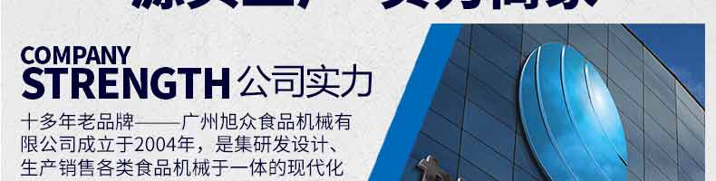 廣州旭眾食品機(jī)械有限公司是一家集科研開發(fā),生產(chǎn)設(shè)計(jì),營(yíng)銷服務(wù)為一體的現(xiàn)代化生產(chǎn)企業(yè)?,F(xiàn)代化生產(chǎn)車間,精湛制造技術(shù),所產(chǎn)機(jī)械歷經(jīng)市場(chǎng)重重考驗(yàn),不斷贏得海內(nèi)外客戶的贊譽(yù)。