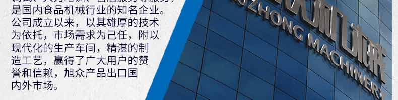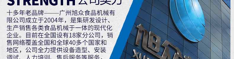 廣州旭眾食品機械有限公司是一家集科研開發(fā),生產(chǎn)設計,營銷服務為一體的現(xiàn)代化生產(chǎn)企業(yè)。現(xiàn)代化生產(chǎn)車間,精湛制造技術(shù),所產(chǎn)機械歷經(jīng)市場重重考驗,不斷贏得海內(nèi)外客戶的贊譽。