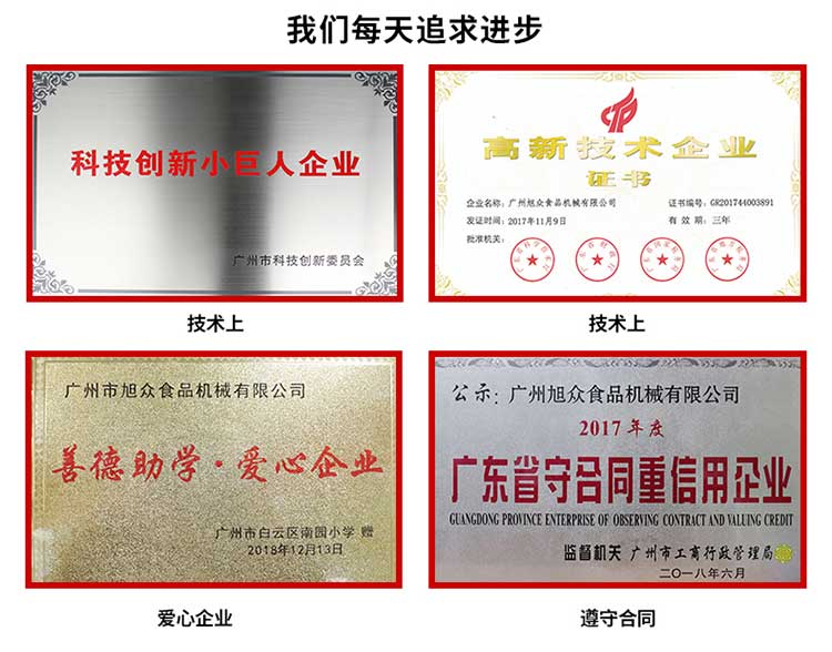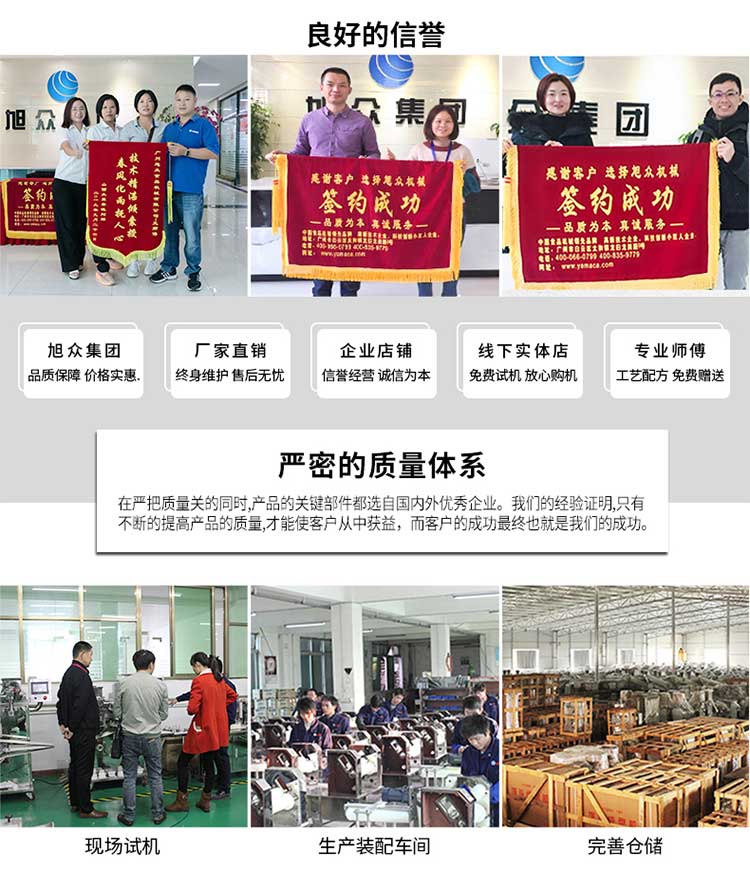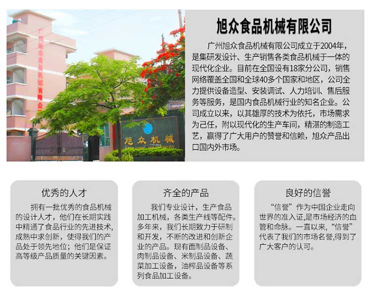 廣州旭眾食品機(jī)械有限公司是一家集科研開發(fā),生產(chǎn)設(shè)計(jì),營(yíng)銷服務(wù)為一體的現(xiàn)代化生產(chǎn)企業(yè)?,F(xiàn)代化生產(chǎn)車間,精湛制造技術(shù),所產(chǎn)機(jī)械歷經(jīng)市場(chǎng)重重考驗(yàn),不斷贏得海內(nèi)外客戶的贊譽(yù)。