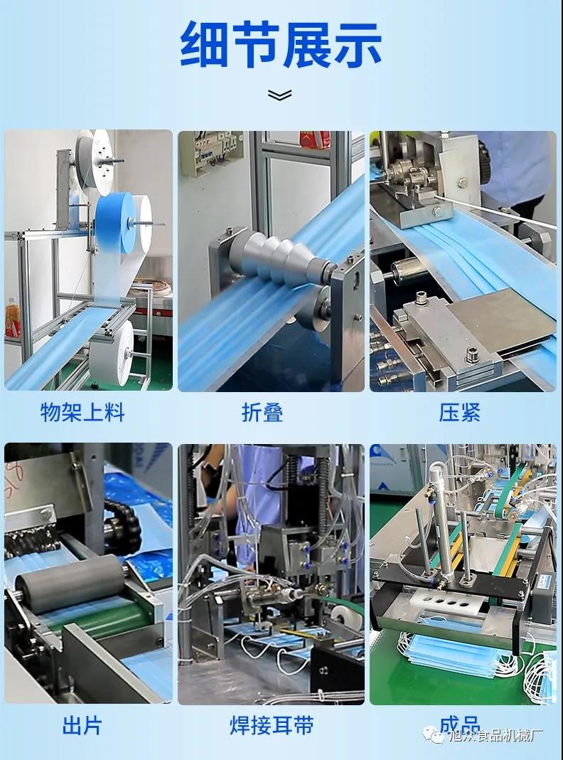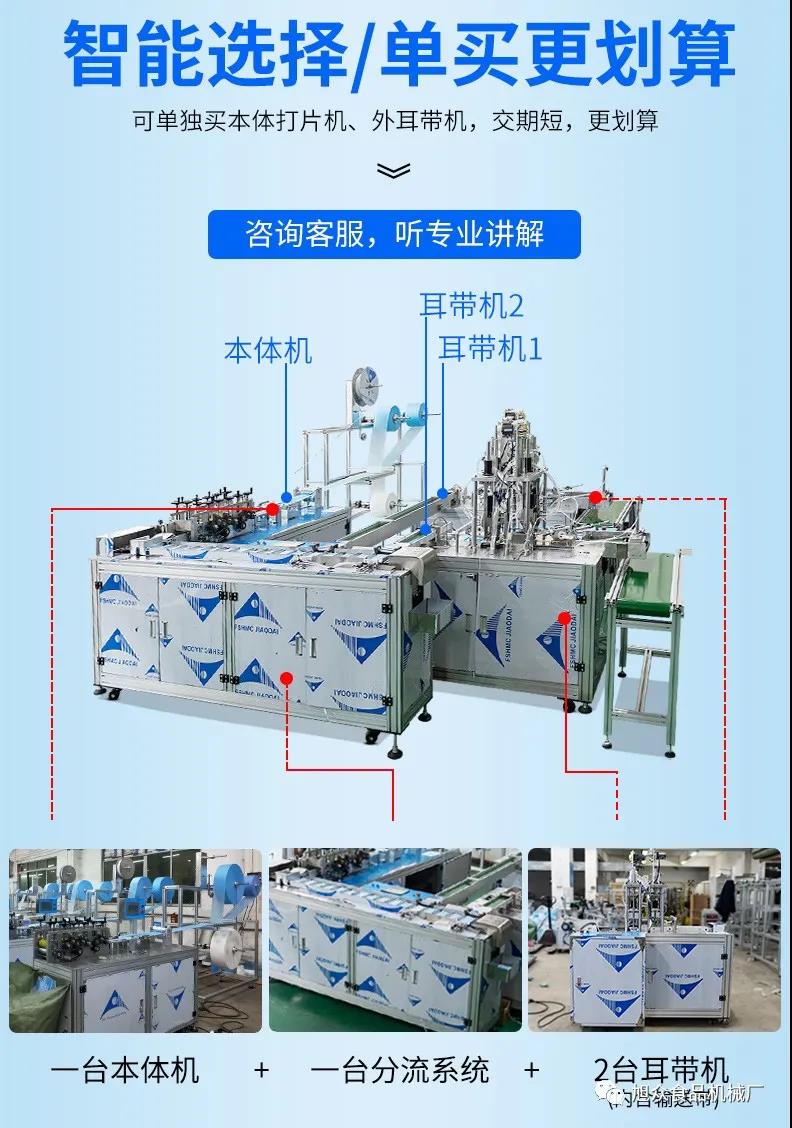 旭眾牌一拖二口罩機(jī)由一臺(tái)本體機(jī)帶動(dòng)兩臺(tái)耳帶機(jī)組成。本體機(jī)輸出ロ罩本體后,由輸送帶結(jié)構(gòu)將口罩本體片輸送到連接耳帶機(jī)的輸送帶上,再通過輸送帶將口罩片輸送到耳帶機(jī)的正面第一個(gè)口罩盤上方,最后通過氣缸下壓把口罩片放置到耳帶機(jī)的口罩盤內(nèi),后續(xù)由耳帶機(jī)完成口罩的耳帶熔接,包邊等動(dòng)作,從而完成一個(gè)耳帶口罩產(chǎn)品的生產(chǎn)。本機(jī)采用PLC、觸摸屏控制、主傳送帶采用單相馬達(dá)輸送、步進(jìn)馬達(dá)翻轉(zhuǎn),傳動(dòng)精確,控制穩(wěn)定,速度可調(diào)。