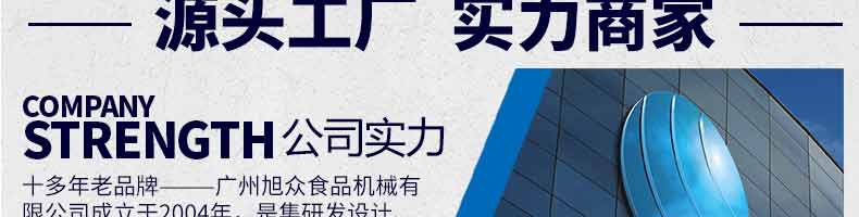 廣州旭眾食品機(jī)械有限公司是一家集科研開發(fā),生產(chǎn)設(shè)計,營銷服務(wù)為一體的現(xiàn)代化生產(chǎn)企業(yè)。現(xiàn)代化生產(chǎn)車間,精湛制造技術(shù),所產(chǎn)機(jī)械歷經(jīng)市場重重考驗,不斷贏得海內(nèi)外客戶的贊譽(yù)。